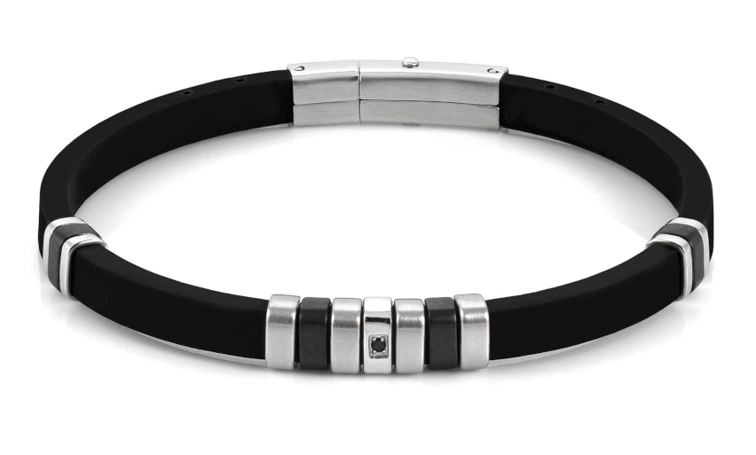 Nomination CITY 028805/015 on tyylikäs rannekoru, jolla piristät asuasi. Koru on valmistettu ruostumattomasta teräksestä ja kumista, ja sitä koristaa mustat kuutiolliset zirkonia-kivet. Korun pituus on säädettävissä 18-21 cm mittaiseksi. Italialaiset Nomination-korut toimitetaan valmistajan alkuperäisessä pakkauksessa.