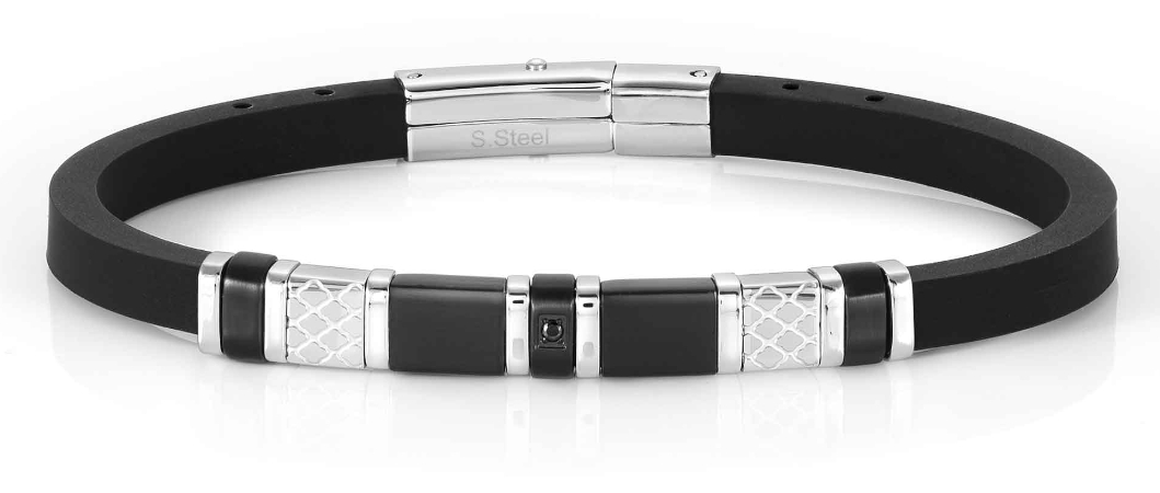 Nomination City on sileä ja moderni korumallisto tyylikästä korua etsivälle. Nomination City rannekoru 028810/001 on valmistettu mustasta kumista, ja korua koristaa teräksiset hopeanväriset ja mustat helat, ja mustat, synteettiset zirkoniat. Tämän miesten rannekorun pituus on säädettävissä välille 19-21 cm. Leveys 0,5 mm. Nomination-korut toimitetaan valmistajan alkuperäisessä pakkauksessa.