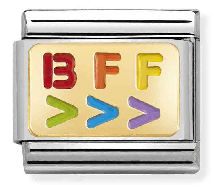 Nomination Classic BFF right arrows 030263-17-hela juhlii ystävyyttä, ja se on mukava lisä omaan Nomination-rannekkeeseen. Korun pinnassa on 18-karaatin kultaus ja teksti BFF, joka on koristeltu monivärisellä emalilla. Helan runko on ruostumatonta terästä. Italialaisilla Nomination-paloilla on kahden vuoden takuu, ja ne toimitetaan valmistajan alkuperäisessä pakkauksessa.