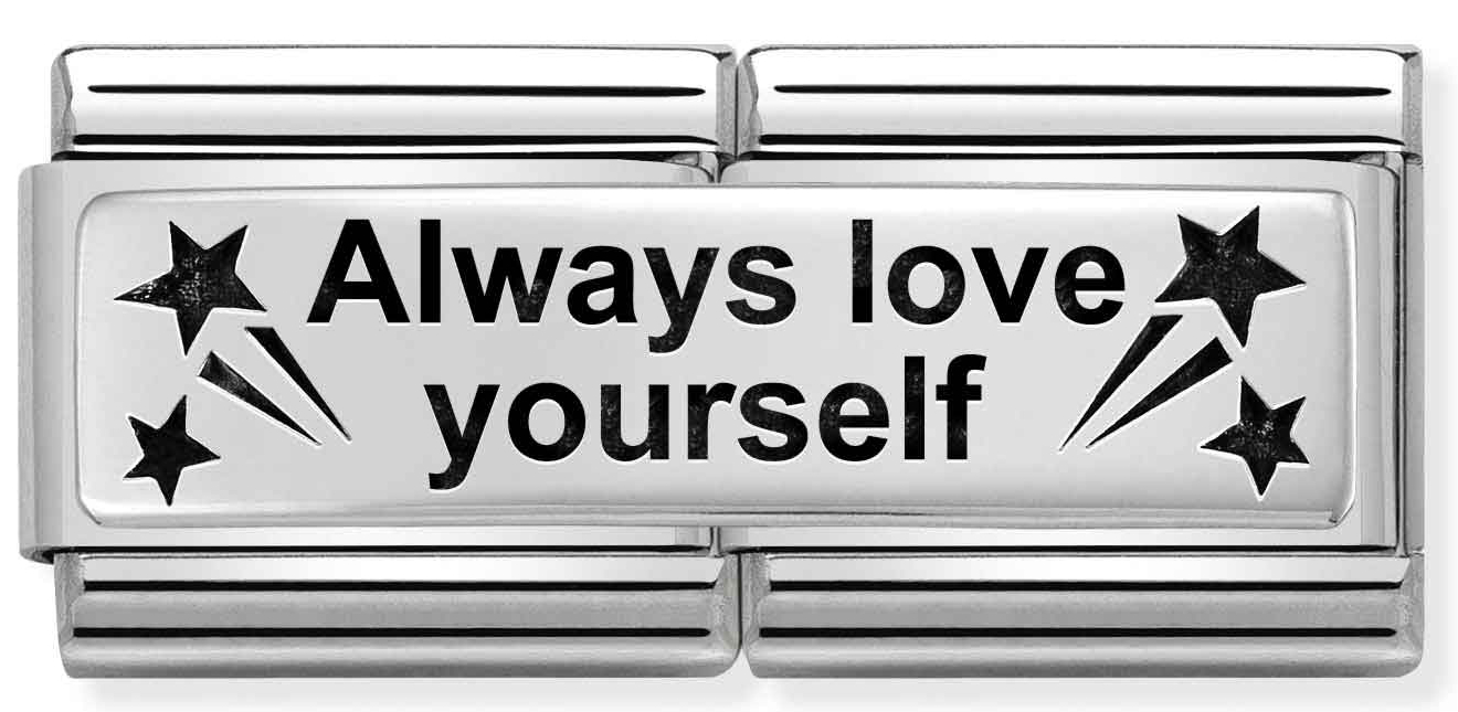 Nomination Classic DOUBLE ENGRAVED CUSTOM Always Love yourself 330710/44-helan pinta on koristeltu sterling-hopealla ja tekstillä "Always Love yourself". Runko on ruostumatonta terästä. Italialaisilla Nomination-paloilla on kahden vuoden takuu, ja ne toimitetaan valmistajan alkuperäisessä pakkauksessa.