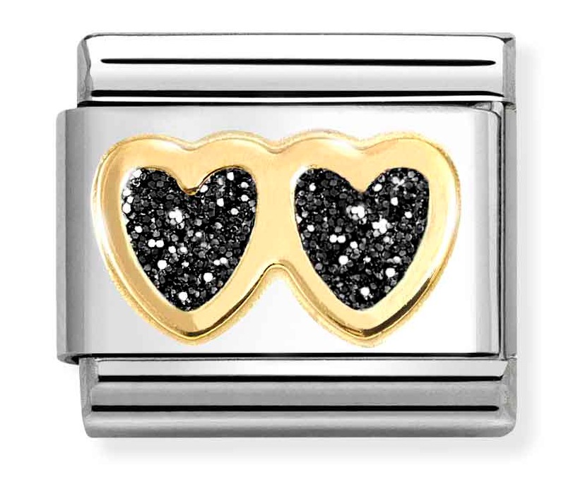 Nomination Classic gold double black heart 030220/14 sydänkorussa kauniit yhteenliitetyt emalisydämet 18-karaatin kultaisessa kehyksessä. Sydänkoru kiinnitetään Nomination-rannekoruun (myydään erikseen) jousimekanismilla. Ota yksi tai kerää vaikka kaikki, ja luo juuri sinulle sopiva rannekoru. Nomination-paloilla on kahden vuoden takuu.