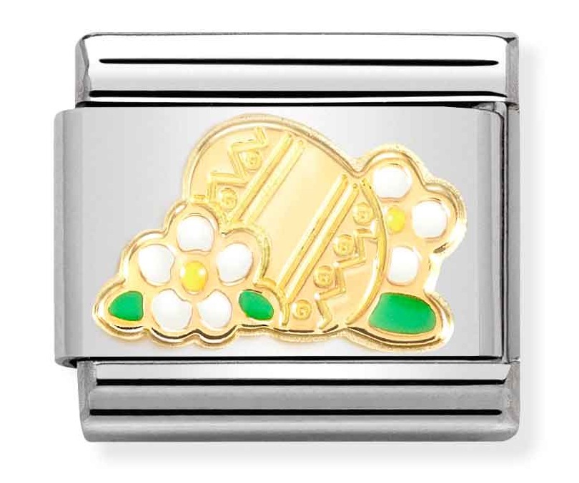 Pääsiäisaiheinen Nomination Classic Gold Easter egg with flowers pala 030272/77 juhliaa kevään tuloa. Tämä pääsiäiskoru on koristeltu 18 karaatin kultauksella, ja se kiinnitetään Nomination-rannekoruun (myydään erikseen) jousimekanismilla. Paloilla on kahden vuoden takuu.