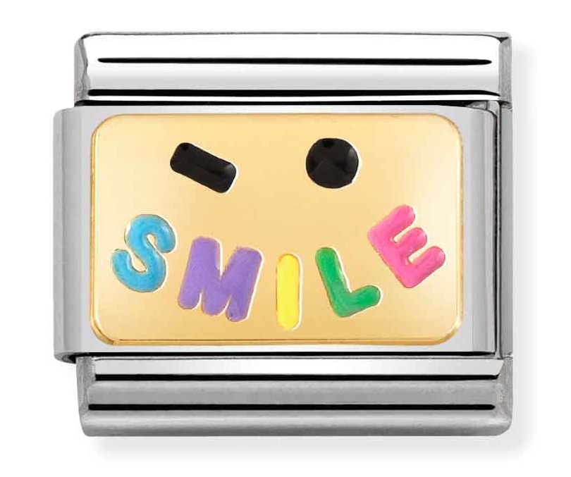 Värikäs ja iloa tuova Nomination Classic Gold Smile plate pala 030284/56 kiinnitetään Nomination-rannekoruun (myydään erikseen) jousimekanismilla. Korun pintaa koristaa 18-karaatin kultaus ja teksti "Smile". Paloilla on kahden vuoden takuu.
