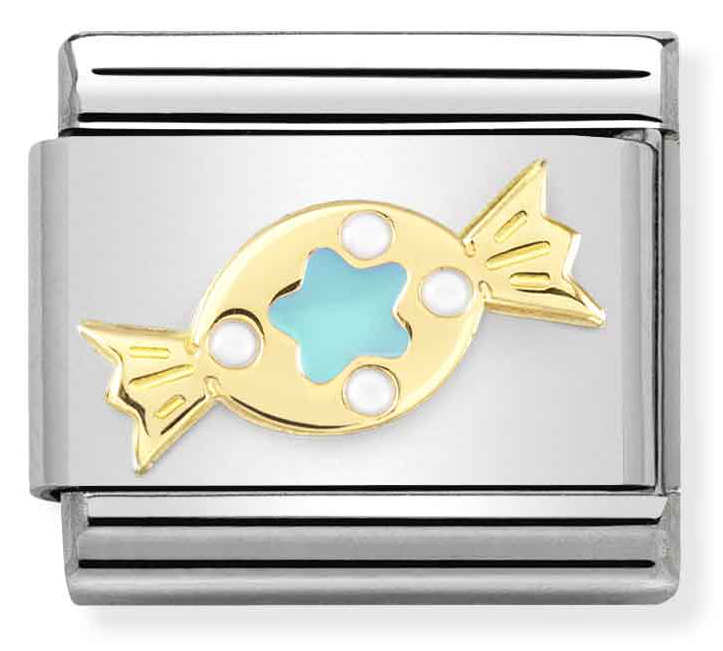 Uudet Nomination Baby collection-korusarjasta löydät useita satuhahmoja ja lapsille sopivia hahmoja. Nomination Classic Gold Torquoise Green Sweet 030272/73 -helassa on kuvattuna turkoosi karamelli. Koru on ruostumatonta terästä ja siinä on 18-karaatin kultaus. Pala kiinnitetään Nomination-rannekoruun (myydään erikseen) jousimekanismilla. Paloilla on kahden vuoden takuu.