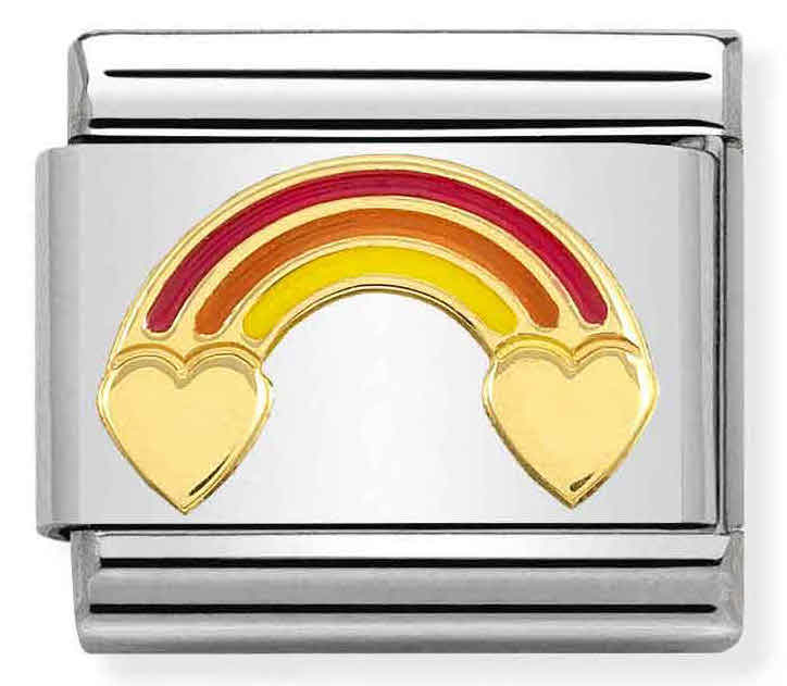 Nomination Classic Rainbow with hearts 030272-52-helan pinnassa on 18-karaatin kultaus ja kaksi sydäntä sateenkaarien päässä. Helan runko on ruostumatonta terästä. Italialaisilla Nomination-paloilla on kahden vuoden takuu, ja ne toimitetaan valmistajan alkuperäisessä pakkauksessa.
