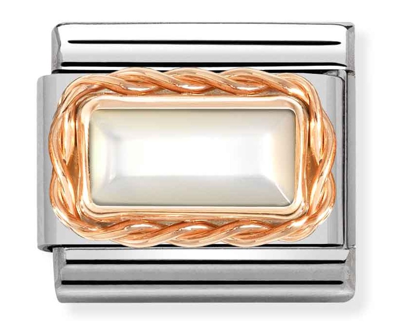 Nomination Classic Rose Gold Buguette Stone White Mother of Pearl pala 430512/12 on täydellinen lisä Nomination-rannekkeeseen. Tämä klassinen korukivi kiinnitetään Nomination-rannekoruun (myydään erikseen) jousimekanismilla. Helmiäistä ympäröi 9-karaatin ruusukultaus. Paloilla on kahden vuoden takuu.