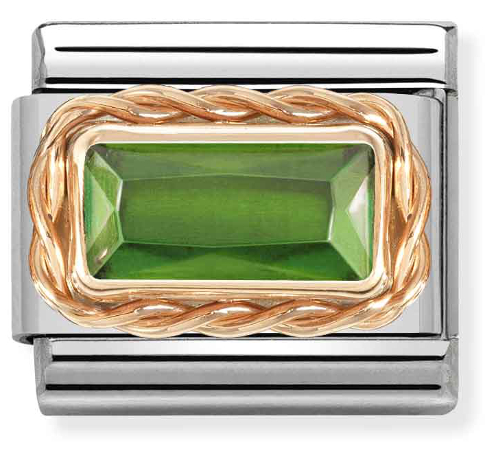 Eriväriset korukivet elävöittävät ihanasti Nomination-rannekorua. Nomination Classic Rose Gold Green Zirconia 430604/004 -palassa on vihreä synteettinen zirkonia, ja pala on ruostumatonta terästä ja 9-karaatin ruusukultaa. Pala kiinnitetään Nomination-rannekoruun (myydään erikseen) jousimekanismilla. Paloilla on kahden vuoden takuu.