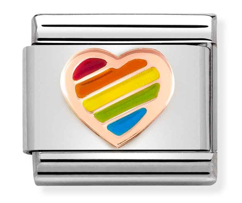 Nomination Classic Rose Gold Heart mix color palaa 430202/15 koristaa sateenkaarisydän ja 9-karaatin ruusukultaus. Pala kiinnitetään Nomination-rannekoruun (myydään erikseen) jousimekanismilla. Paloilla on kahden vuoden takuu.