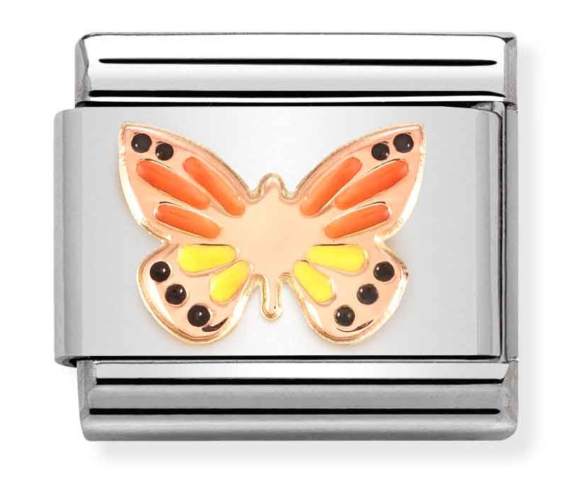 Nomination Classic Rose Gold Rainbow butterfly pala 430202/17 on kesäinen lisä Nomination-rannekkeeseen, ja korua koristaa 9-karaatin ruusukultaus ja värikäs emalointi. Pala kiinnitetään Nomination-rannekoruun (myydään erikseen) jousimekanismilla. Paloilla on kahden vuoden takuu.