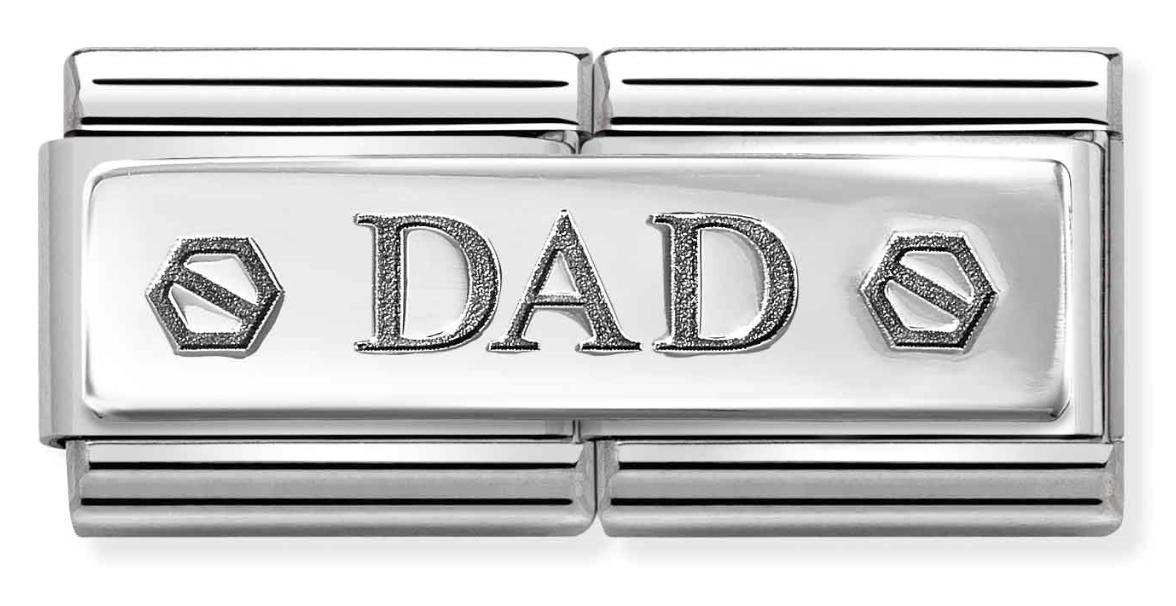 Muista isää korulla. Nomination Classic Silvershine bouble engraved custom dad with hex screws 330710/48 on koristeltu tekstillä "dad". Koru on sterling-hopeaa ja ruostumatonta terästä. Koru kiinnitetään Nomination-rannekoruun (myydään erikseen) jousimekanismilla. Ota yksi tai kerää vaikka kaikki, ja luo juuri sinulle sopiva rannekoru. Korun pinta on viimeistelty emalilla ja sterling-hopealla. Paloilla on kahden vuoden takuu.