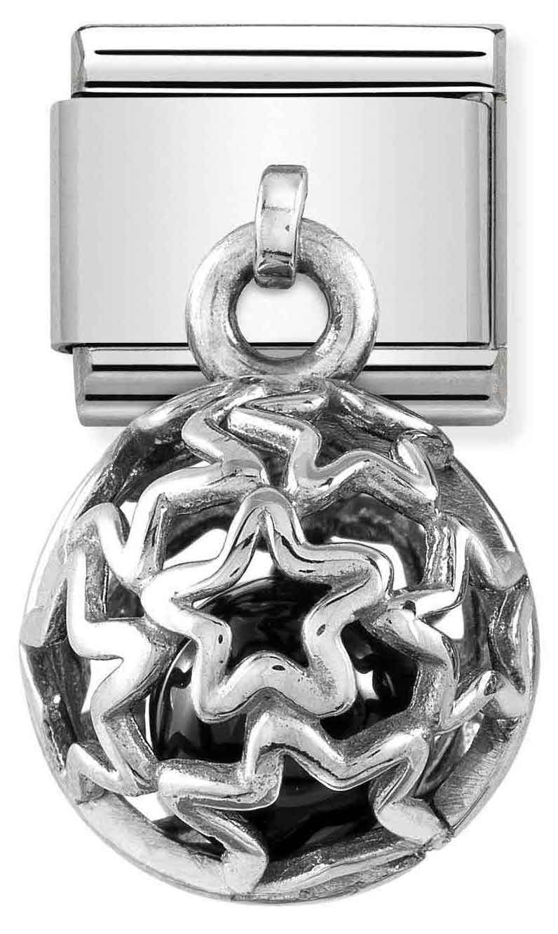 Nomination Classic SilverShine Charms black agate stars 331810-08-sterling-hopeisessa riippuva helassa loistaa kauneimmat yötaivaan tähdet ja korun sisällä säkenöi ajaton musta akaattihelmi. Helan runko on valmistettu ruostumattomasta teräksestä ja musta oksidointi viimeistelee hopean ajattoman ilmeen. Nomination-paloilla on kahden vuoden takuu, ja ne toimitetaan valmistajan alkuperäisessä pakkauksessa.