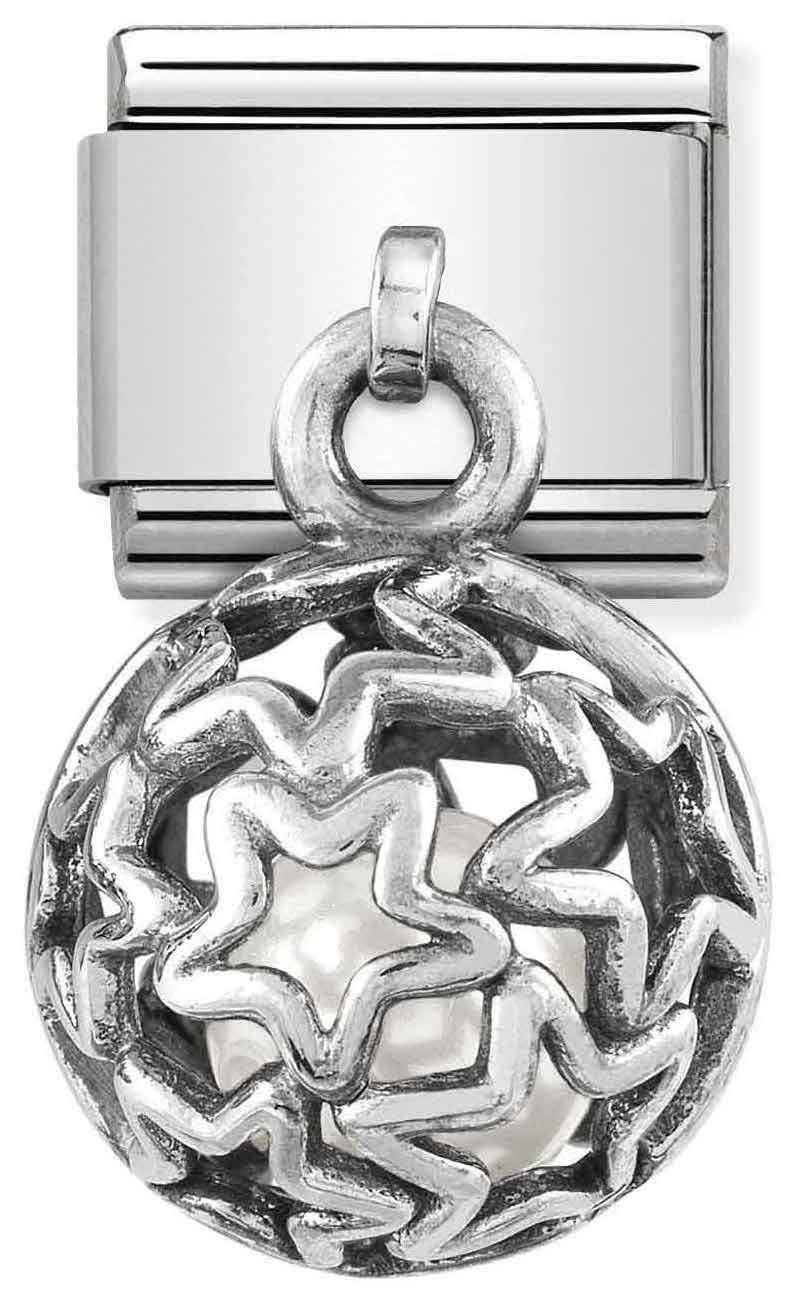Nomination Classic SilverShine Charms white stars 331810-07-sterling-hopeisessa riippuva helassa loistaa kauneimmat yötaivaan tähdet ja korun sisällä säkenöi ajaton valkoinen helmi. Helan runko on valmistettu ruostumattomasta teräksestä ja musta oksidointi viimeistelee hopean ajattoman ilmeen. Nomination-paloilla on kahden vuoden takuu, ja ne toimitetaan valmistajan alkuperäisessä pakkauksessa.