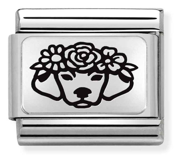 Nomination Classic Silvershine Dog Flowers 330111/24-helassa on kuvattuna koira. Korun pinta on koristeltu sterling-hopealla, ja runko on ruostumatonta terästä. Italialaisilla Nomination-paloilla on kahden vuoden takuu, ja ne toimitetaan valmistajan alkuperäisessä pakkauksessa.