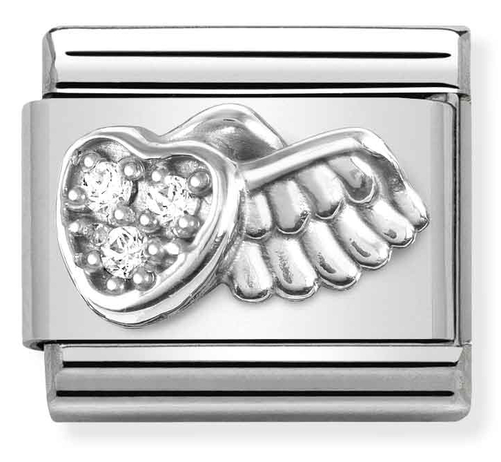 Nomination Classic Silvershine Winged Heart with Cz 330304/42 -palassa kuvattu siivillä varustettu sydän. koru symboloi rakkautta ja rohkaisee kantajaansa rakastamaan ehdoitta. Koru on ruostumatonta terästä ja sterling-hopeaa. Pala kiinnitetään Nomination-rannekoruun (myydään erikseen) jousimekanismilla. Paloilla on kahden vuoden takuu.