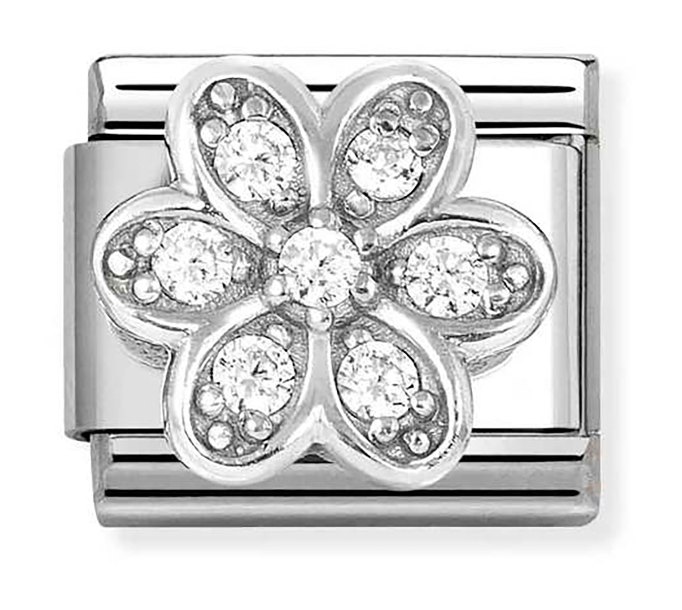 Nomination Composable cl rich white daisy 330322/06 helassa on näyttävä kukkakuviointi, jonka lehtien sisäosat koostuu monista kirkkaista zirkonioista. Hela on valmistettu oksidoidusta 925-sterling hopeasta ja ruostumattomasta teräksestä. Hela on kooltaan 0,9 x 1 cm. Italialaisilla Nomination-paloilla on kahden vuoden takuu, ja ne toimitetaan valmistajan alkuperäisessä pakkauksessa.