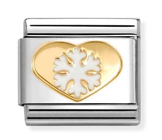 Nomination Composable Classic Christmas Classic gold heart with snowflake 030225/26 juhlistaa talvea, ja on valmistettu ruostumattomasta teräksestä, ja korussa on 18-karaatin kultaus, ja emalointi. Helan koko on 0,7 x 1 cm. Italialaisilla Nomination-paloilla on kahden vuoden takuu, ja ne toimitetaan valmistajan alkuperäisessä pakkauksessa.