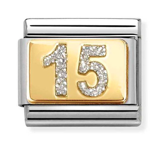 Nomination Composable Classic Glitter Plates Classic gold 15 Silver 030224/07 on valmistettu ruostumattomasta teräksestä, ja korussa on 18-karaatin kultaus, glitter-emalointi ja numero 15. Helan koko on 0,7 x 1 cm. Italialaisilla Nomination-paloilla on kahden vuoden takuu, ja ne toimitetaan valmistajan alkuperäisessä pakkauksessa.