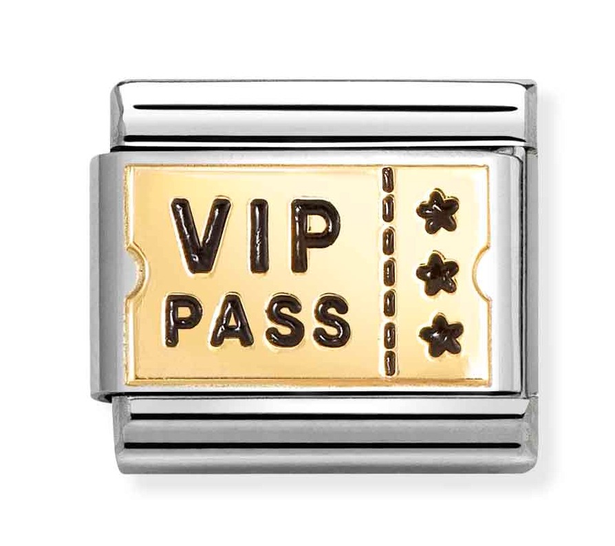 Nomination Composable Classic gold plates VIP PASS 030284/62 on koristeltu 18-karaatin kullalla, ja runko on ruostumatonta terästä. Italialaisilla Nomination-paloilla on kahden vuoden takuu, ja ne toimitetaan valmistajan alkuperäisessä pakkauksessa.