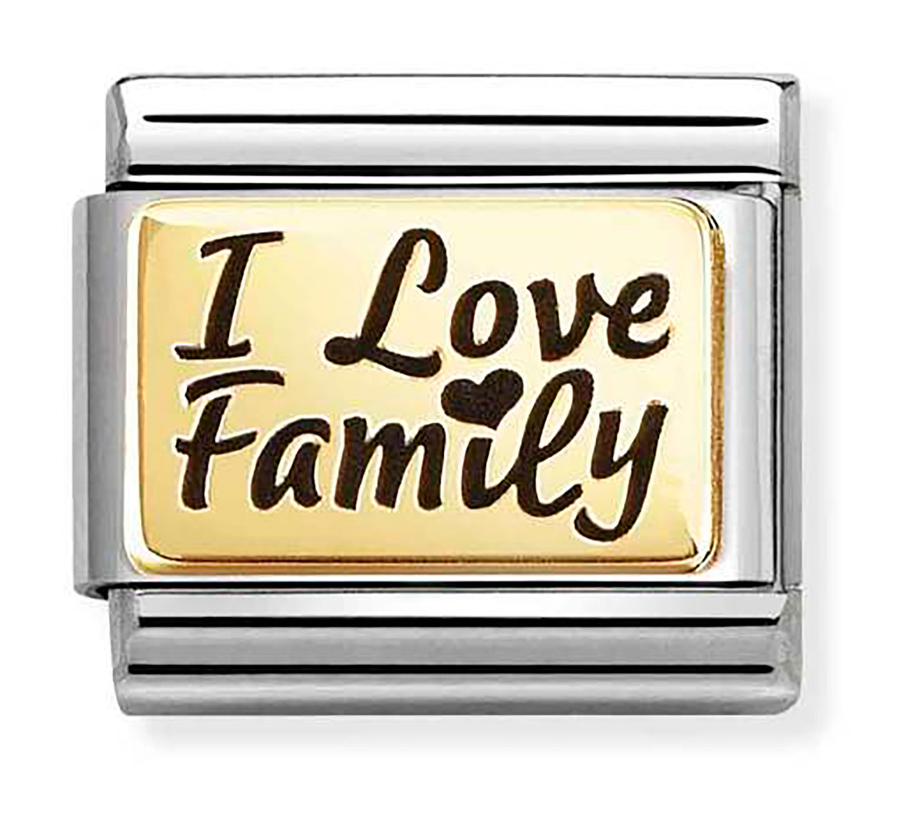 Muista perheenjäseniäsi tällä ihastuttavalla helalla! Nomination Composable Classic I Love Family 030166/69 -korun pinta on koristeltu 18-karaatin kullalla ja sen runko on ruostumatonta terästä. Palassa on tekstinä "I Love Family". Koko: 0,7 x 1 cm. Italialaisilla Nomination-paloilla on kahden vuoden takuu, ja ne toimitetaan valmistajan alkuperäisessä pakkauksessa.