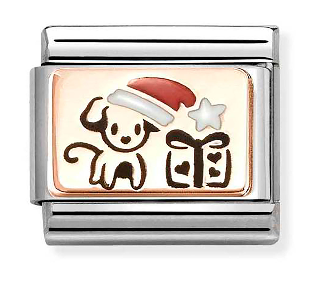 Nomination Composable Classic Tanssiva Pari 430204/07 -korun pinta on koristeltu 9-karaatin kullalla ja sen runko on ruostumatonta terästä. Palassa on kuviona ihastuttava koira tonttulakki päässä, lahjapaketin vieressä. Koko: 0,7 x 1 cm. Italialaisilla Nomination-paloilla on kahden vuoden takuu, ja ne toimitetaan valmistajan alkuperäisessä pakkauksessa.