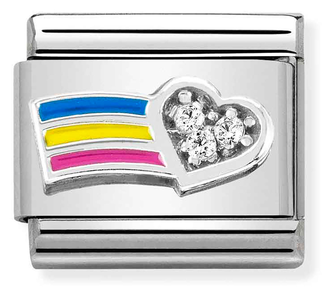 Nomination Composable Classic Link Silver Rainbow 330321 01. Nomination-palat on valmistettu laadukkaasta ruostumattomasta teräksestä ja sterling-hopeasta. Kuvassa sateenkaari ja zirkonioin koristeltu sydän. Nomination-paloille myönnetään kahden vuoden takuu! Italialaiset Nomination-korut toimitetaan valmistajan alkuperäisessä pakkauksessa.