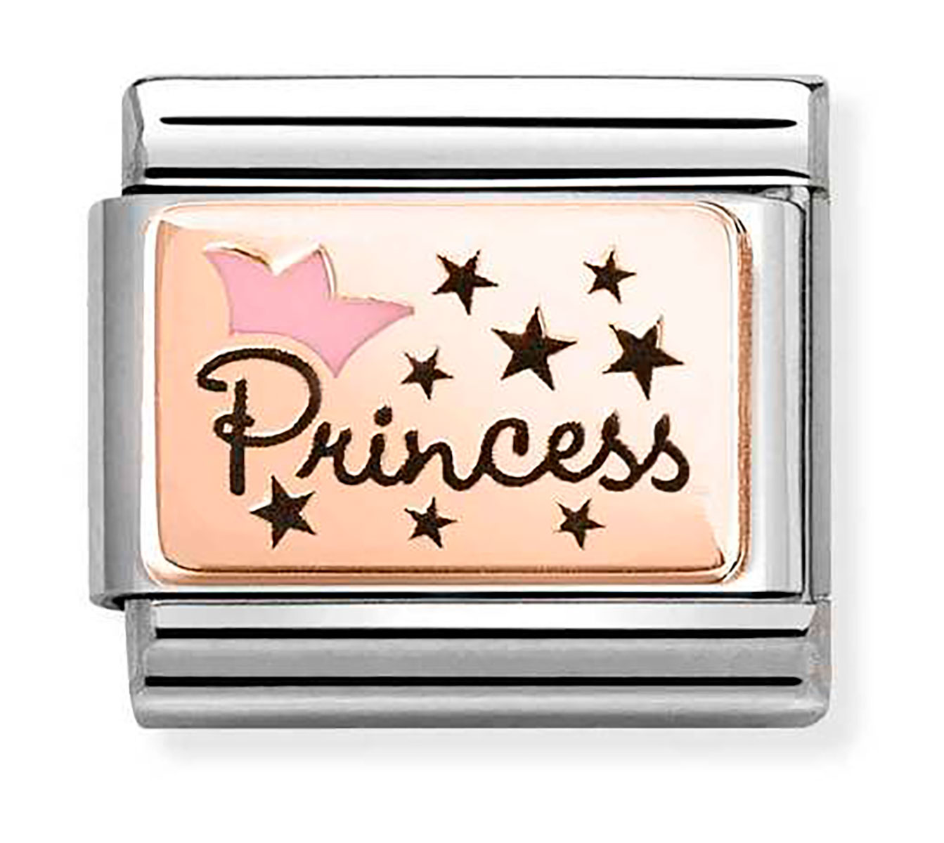 Nomination Composable Classic pink princess crown 430204/02 emaloitu hela on valmistettu 9k punakullasta ja ruostumattomasta teräksestä. Helassa on koristeltuna teksti "Princess" sekä mustia tähtiä ja vaaleanpunainen kruunu. Helan koko on 0,9 x 1 cm. Italialaisilla Nomination-paloilla on kahden vuoden takuu, ja ne toimitetaan valmistajan alkuperäisessä pakkauksessa.