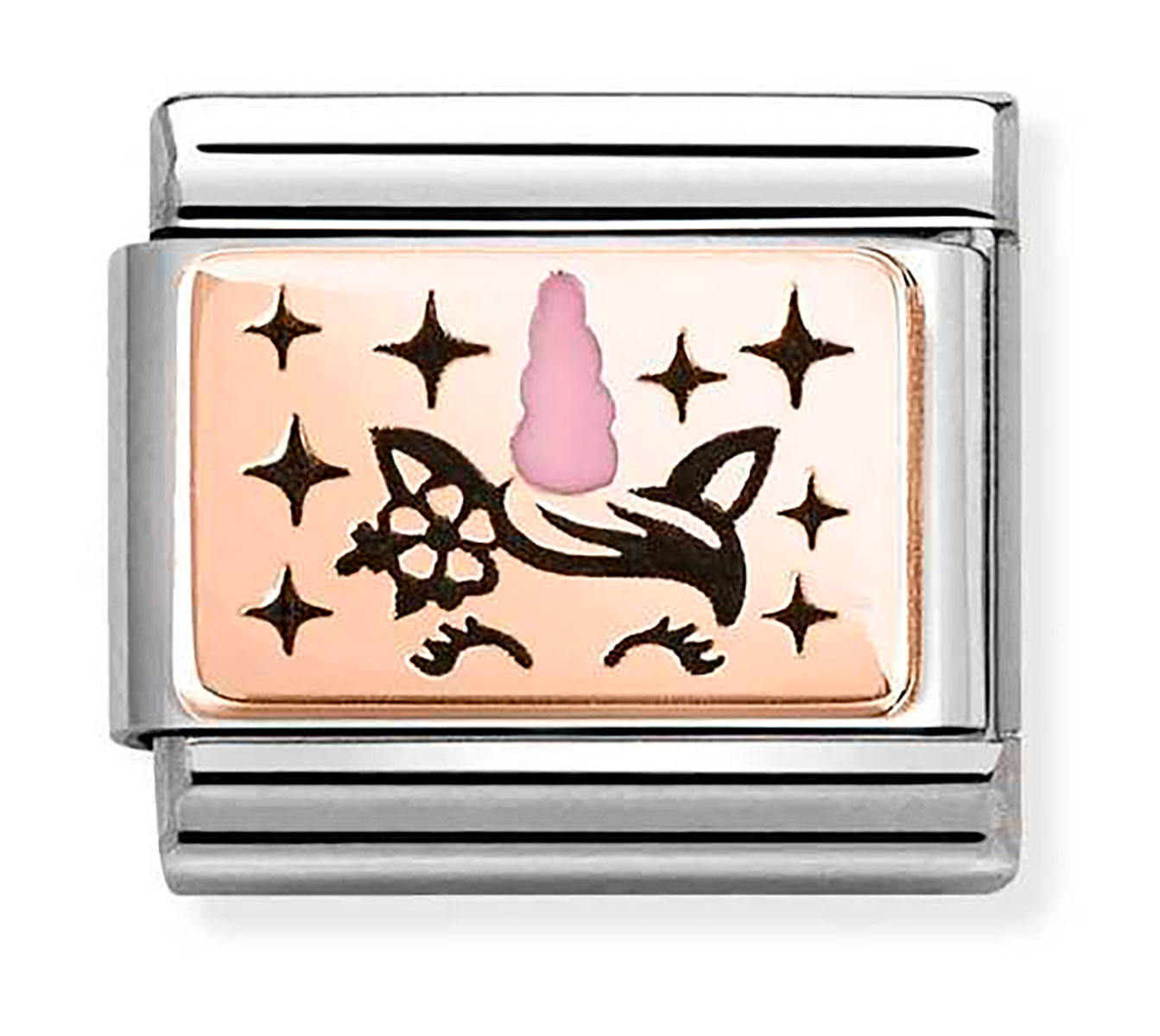 Nomination Composable Classic pink unicorn 430204/03 emaloitu hela on valmistettu 9k punakullasta ja ruostumattomasta teräksestä. Helan koko on 0,9 x 1 cm. Italialaisilla Nomination-paloilla on kahden vuoden takuu, ja ne toimitetaan valmistajan alkuperäisessä pakkauksessa.