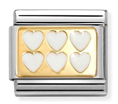 Nomination Composable Classic Plates classic gold White line hearts 030284/69 on valmistettu ruostumattomasta teräksestä, ja korussa on 18-karaatin kultaus, ja emalointi. Helan koko on 0,7 x 1 cm. Italialaisilla Nomination-paloilla on kahden vuoden takuu, ja ne toimitetaan valmistajan alkuperäisessä pakkauksessa.
