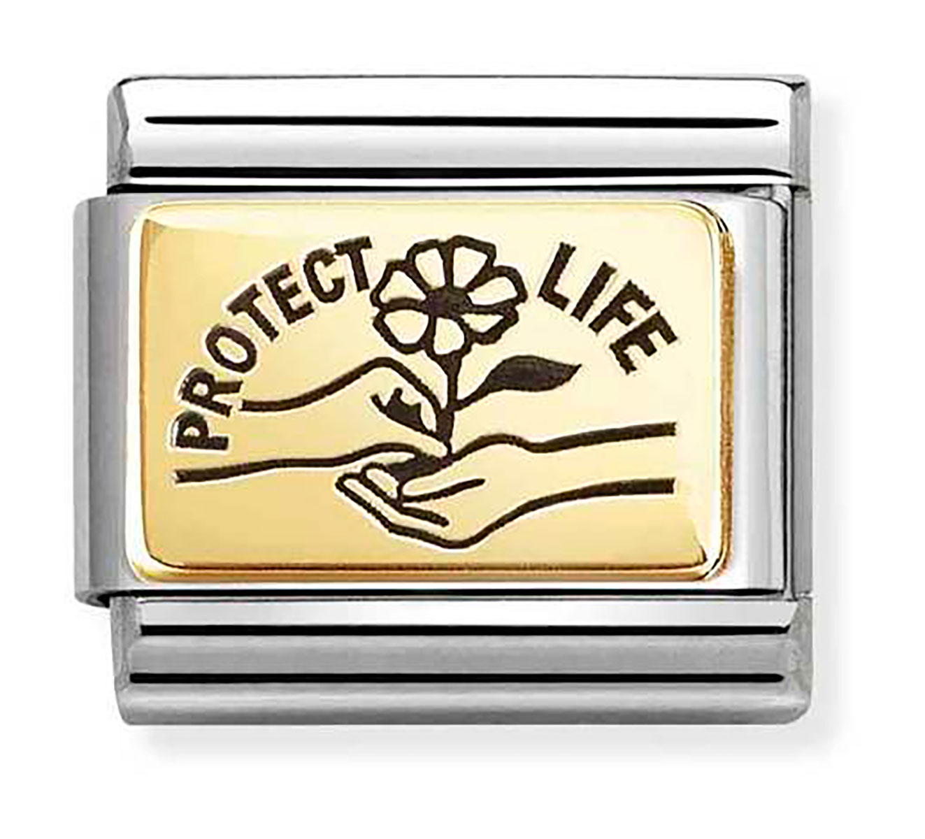 Nomination Composable Classic Protect Life 030166/66 -korun pinta on koristeltu 18-karaatin kullalla ja sen runko on ruostumatonta terästä. Palassa on kuviona käsi ojentamassa kasvia toiselle ja teksti "Protect Life". Koko: 0,7 x 1 cm. Italialaisilla Nomination-paloilla on kahden vuoden takuu, ja ne toimitetaan valmistajan alkuperäisessä pakkauksessa.
