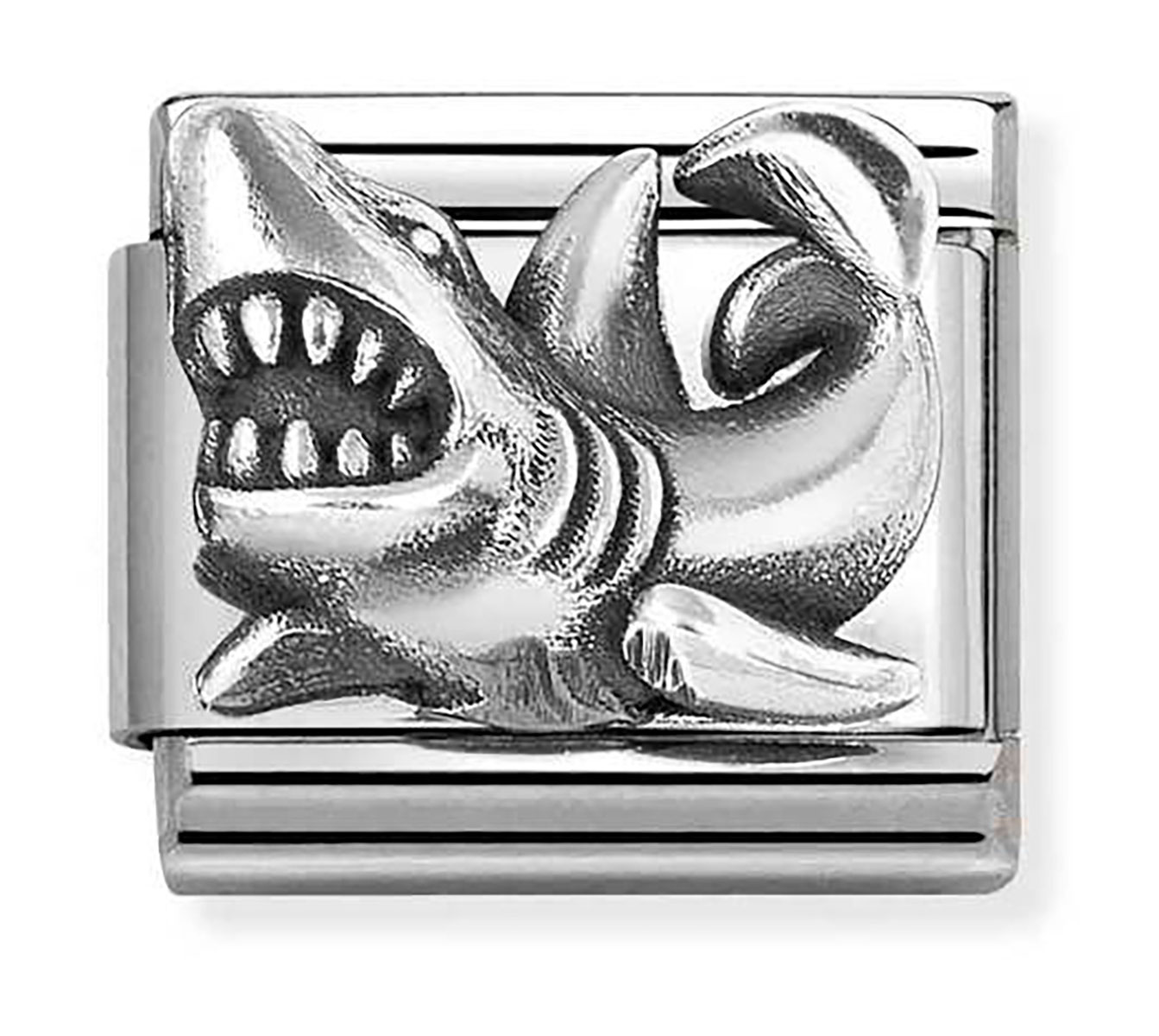Nomination Composable Classic shark 330101/87 helassa on kuvioituna hurjan näköinen hai. Hela on valmistettu oksidoidusta 925-sterling hopeasta ja ruostumattomasta teräksestä. Helan koko on 0,9 x 1 cm. Italialaisilla Nomination-paloilla on kahden vuoden takuu, ja ne toimitetaan valmistajan alkuperäisessä pakkauksessa.