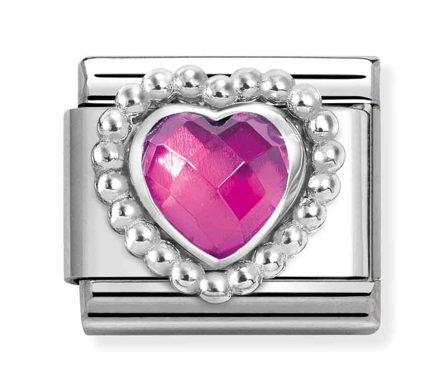 Nomination Composable Classic Silvershine faceted stones heart with Dots rich setting FUCHSIA 330605/ 030-sydänkorua koristaa fuksianpunainen kivi. Koru kiinnitetään Nomination-rannekoruun (myydään erikseen). Ota yksi tai kerää vaikka kaikki, ja luo juuri sinulle sopiva rannekoru. Paloilla on kahden vuoden takuu.
