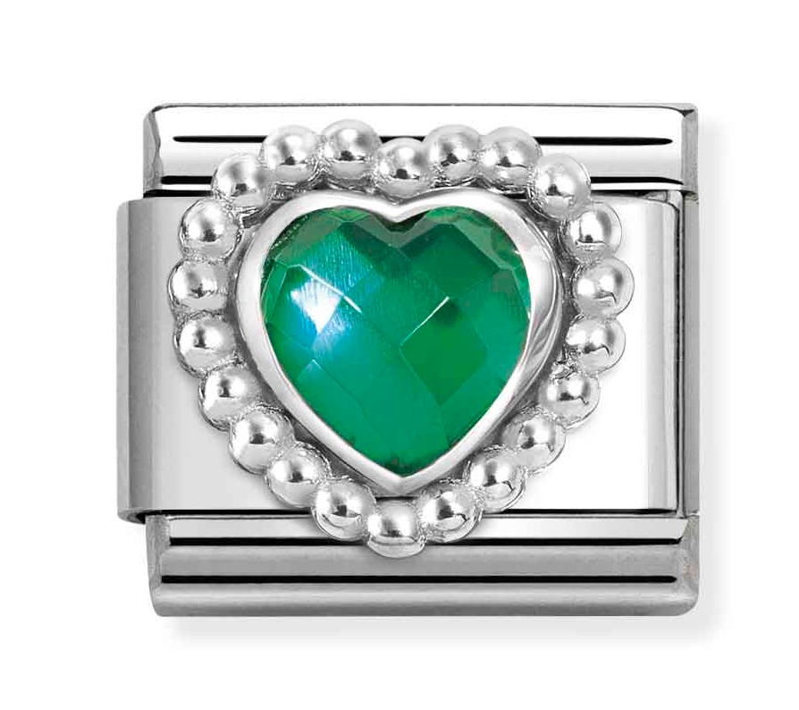 Nomination Composable Classic Silvershine faceted stones heart with Dots rich setting GREEN 330605/004-sydänkorua koristaa vihreä kivi. Koru kiinnitetään Nomination-rannekoruun (myydään erikseen). Ota yksi tai kerää vaikka kaikki, ja luo juuri sinulle sopiva rannekoru. Paloilla on kahden vuoden takuu.