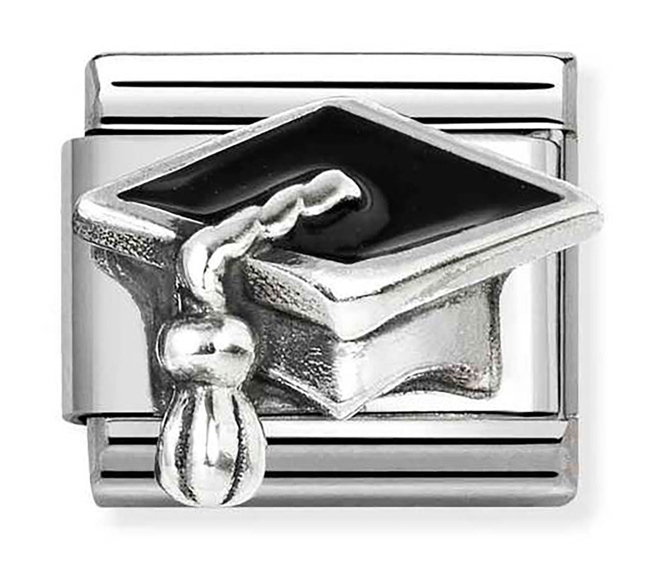 Nomination Composable Classic symbols black graduation hat 330204/32 helassa on kuvioituna tyylikäs musta/hopea valmistujaishattu. Hela sopii erinomaisesti pieneksi ja hienovaraiseksi valmistujaiskoruksi. Hela on valmistettu 925-sterling hopeasta ja ruostumattomasta teräksestä. Hela on kooltaan 0,9 x 1 cm. Italialaisilla Nomination-paloilla on kahden vuoden takuu, ja ne toimitetaan valmistajan alkuperäisessä pakkauksessa.