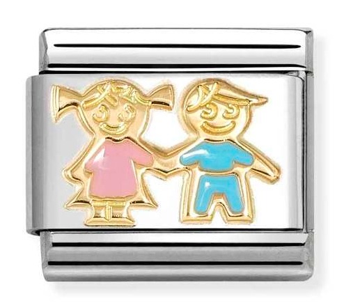 Muista sisaruksia korulla! Nomination Composable Classic Symbols Classic gold Brothers and sisters Pink blue 030272/92 on valmistettu ruostumattomasta teräksestä, ja korussa on 18-karaatin kultaus, ja emalointi, sekä tyttö ja poika. Helan koko on 0,7 x 1 cm. Italialaisilla Nomination-paloilla on kahden vuoden takuu, ja ne toimitetaan valmistajan alkuperäisessä pakkauksessa.
