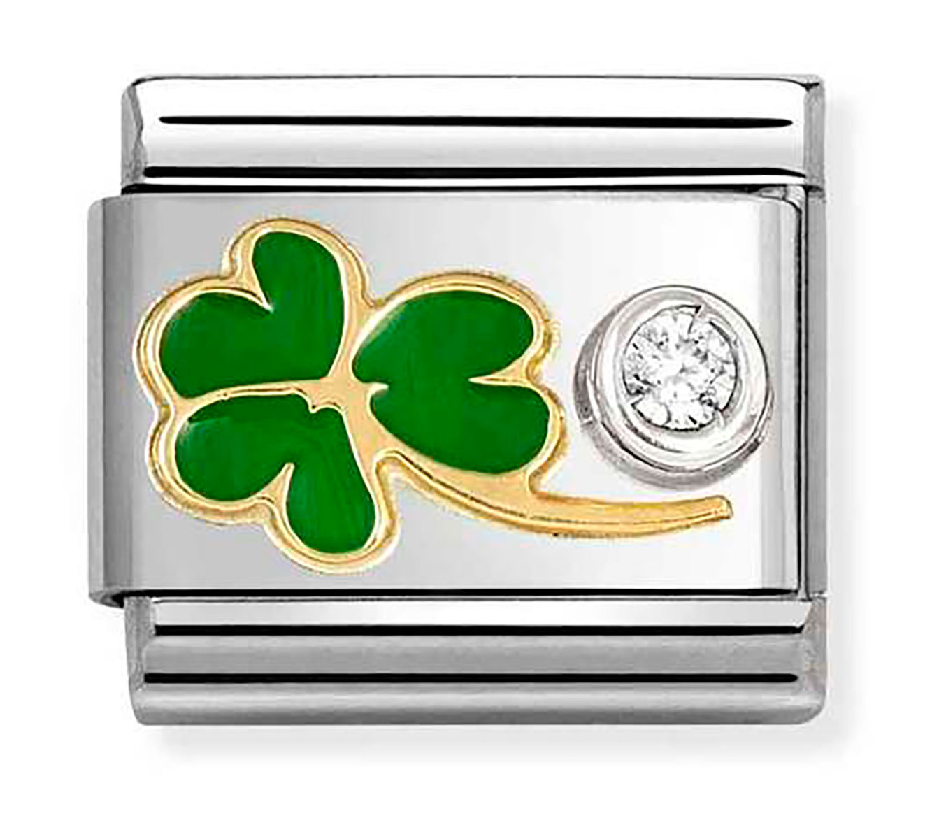Nomination Composable Classic symbols enamel green clover 630302/12 helassa on kuvioituna vihreä apila, jonka vierellä on kirkas zirkonia. Valmistettu ruostumattomasta teräksestä, värikkäästä emalista ja 18k keltakullasta. Helan koko on 0,9 x 1 cm. Italialaisilla Nomination-paloilla on kahden vuoden takuu, ja ne toimitetaan valmistajan alkuperäisessä pakkauksessa.