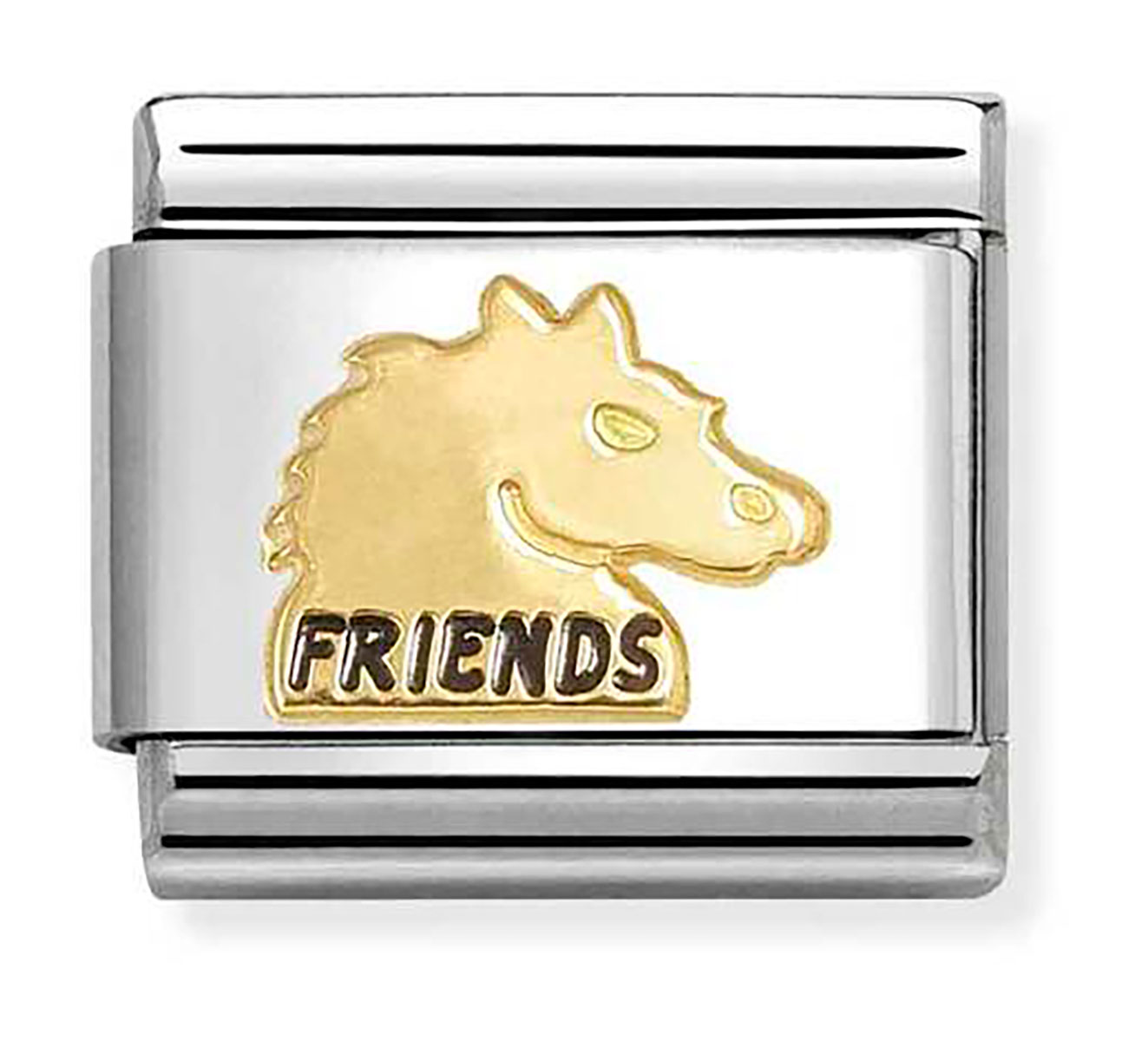 Nomination Composable Classic Symbols Friends 030285/71 -korun pinta on koristeltu 18-karaatin kullalla ja sen runko on ruostumatonta terästä. Korussa on kullattu hevonen, jota koristaa sana "Friends". Koko: 0,7 x 1 cm. Italialaisilla Nomination-paloilla on kahden vuoden takuu, ja ne toimitetaan valmistajan alkuperäisessä pakkauksessa.