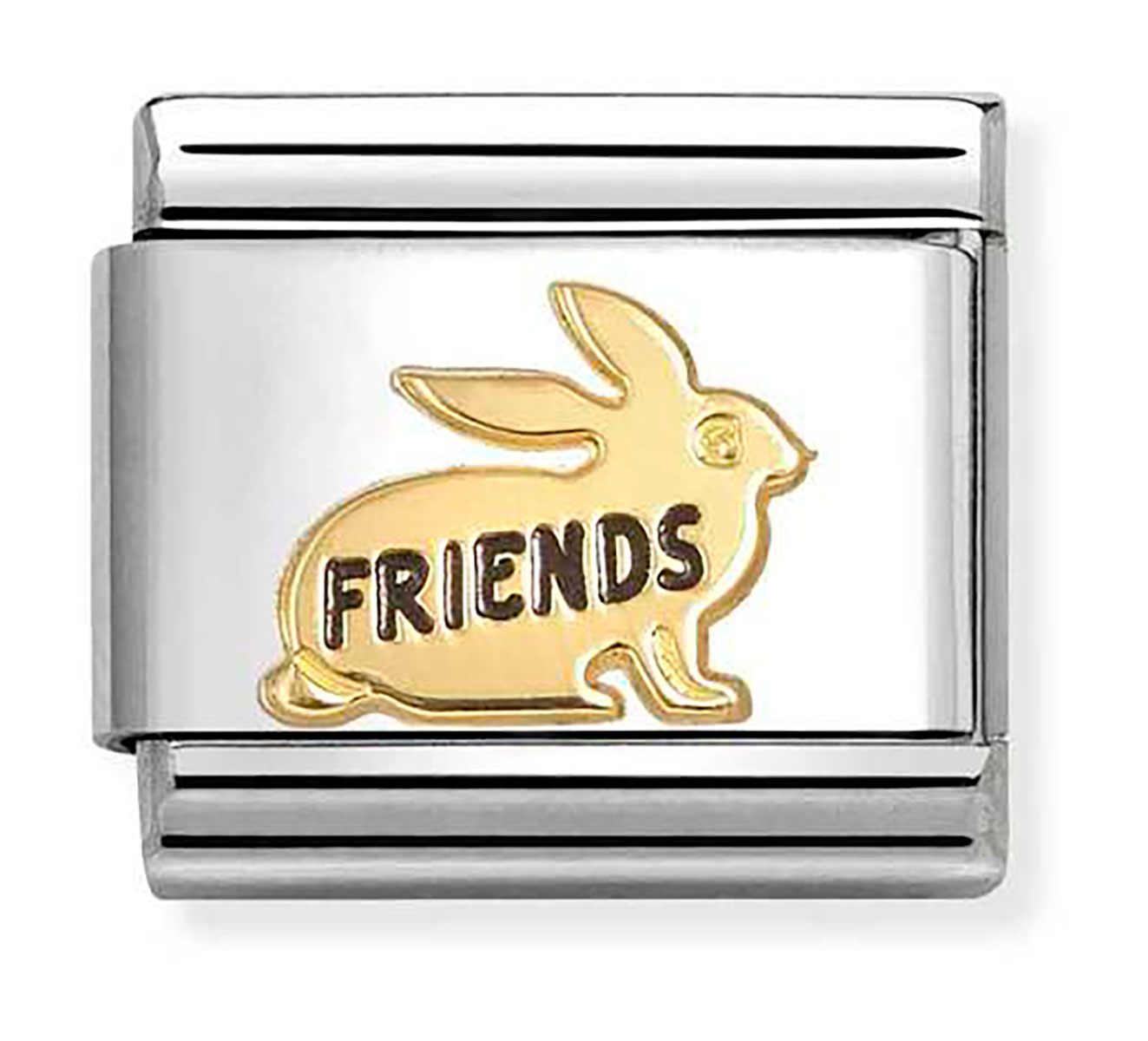Nomination Composable Classic Symbols Friends 030285/73 -korun pinta on koristeltu 18-karaatin kullalla ja sen runko on ruostumatonta terästä. Korussa on kullattu jänis, jota koristaa sana "Friends". Koko: 0,7 x 1 cm. Italialaisilla Nomination-paloilla on kahden vuoden takuu, ja ne toimitetaan valmistajan alkuperäisessä pakkauksessa.