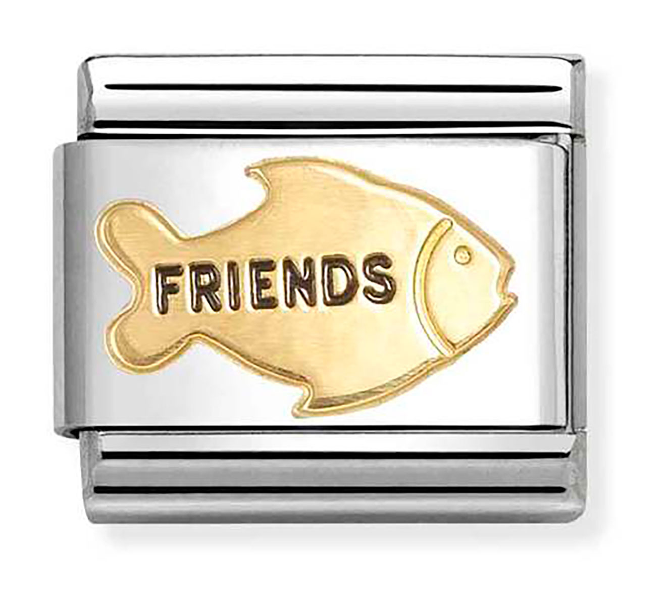 Nomination Composable Classic Symbols Friends 030285/75 -korun pinta on koristeltu 18-karaatin kullalla ja sen runko on ruostumatonta terästä. Korussa on kullattu kala, jota koristaa sana "Friends". Koko: 0,7 x 1 cm. Italialaisilla Nomination-paloilla on kahden vuoden takuu, ja ne toimitetaan valmistajan alkuperäisessä pakkauksessa.