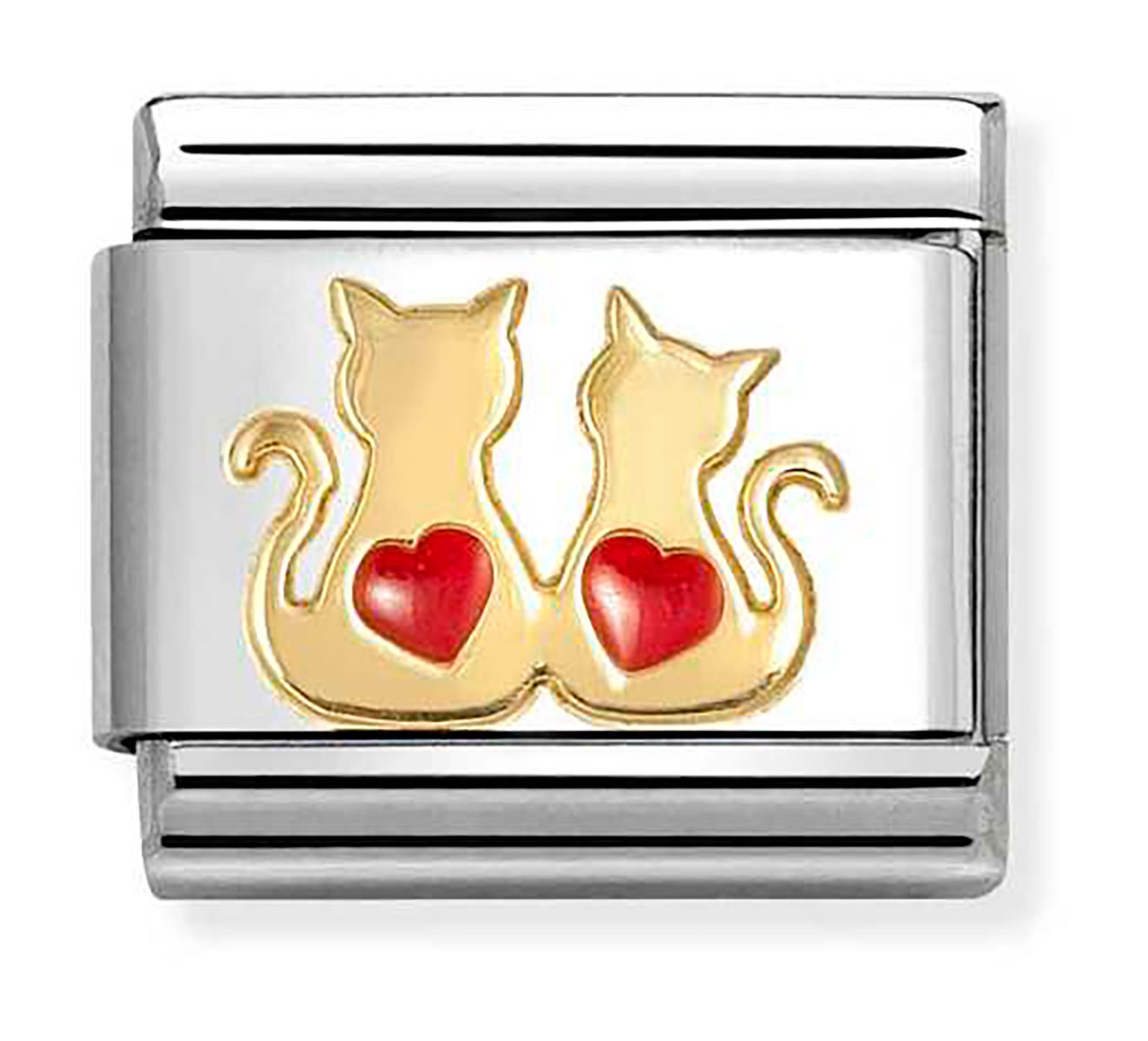 Tässä sopiva hela kissojen ystäville! Nomination Composable Classic Symbols Friends 030285/70 -korun pinta on koristeltu 18-karaatin kullalla ja sen runko on ruostumatonta terästä. Korussa on kaksi kullattua kissaa, joissa on punainen emalisydän. Koko: 0,7 x 1 cm. Italialaisilla Nomination-paloilla on kahden vuoden takuu, ja ne toimitetaan valmistajan alkuperäisessä pakkauksessa.