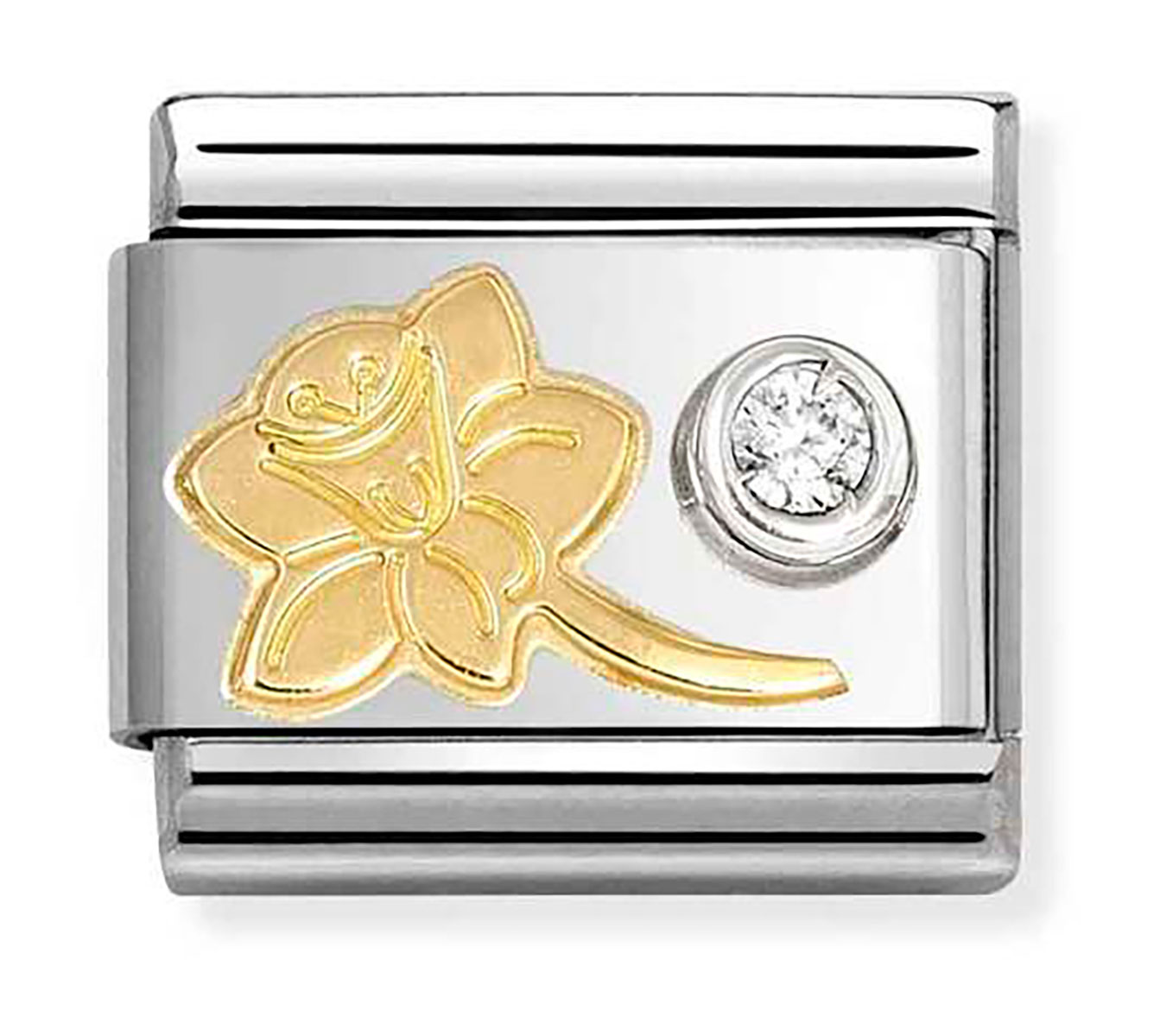 Nomination Composable Classic symbols narcissus cz 630301/05 helassa on kuvioituna kullanvärinen narsissi, jonka vierellä on kirkas zirkonia. Valmistettu ruostumattomasta teräksestä, värikkäästä emalista ja 18k keltakullasta. Helan koko on 0,9 x 1 cm. Italialaisilla Nomination-paloilla on kahden vuoden takuu, ja ne toimitetaan valmistajan alkuperäisessä pakkauksessa.
