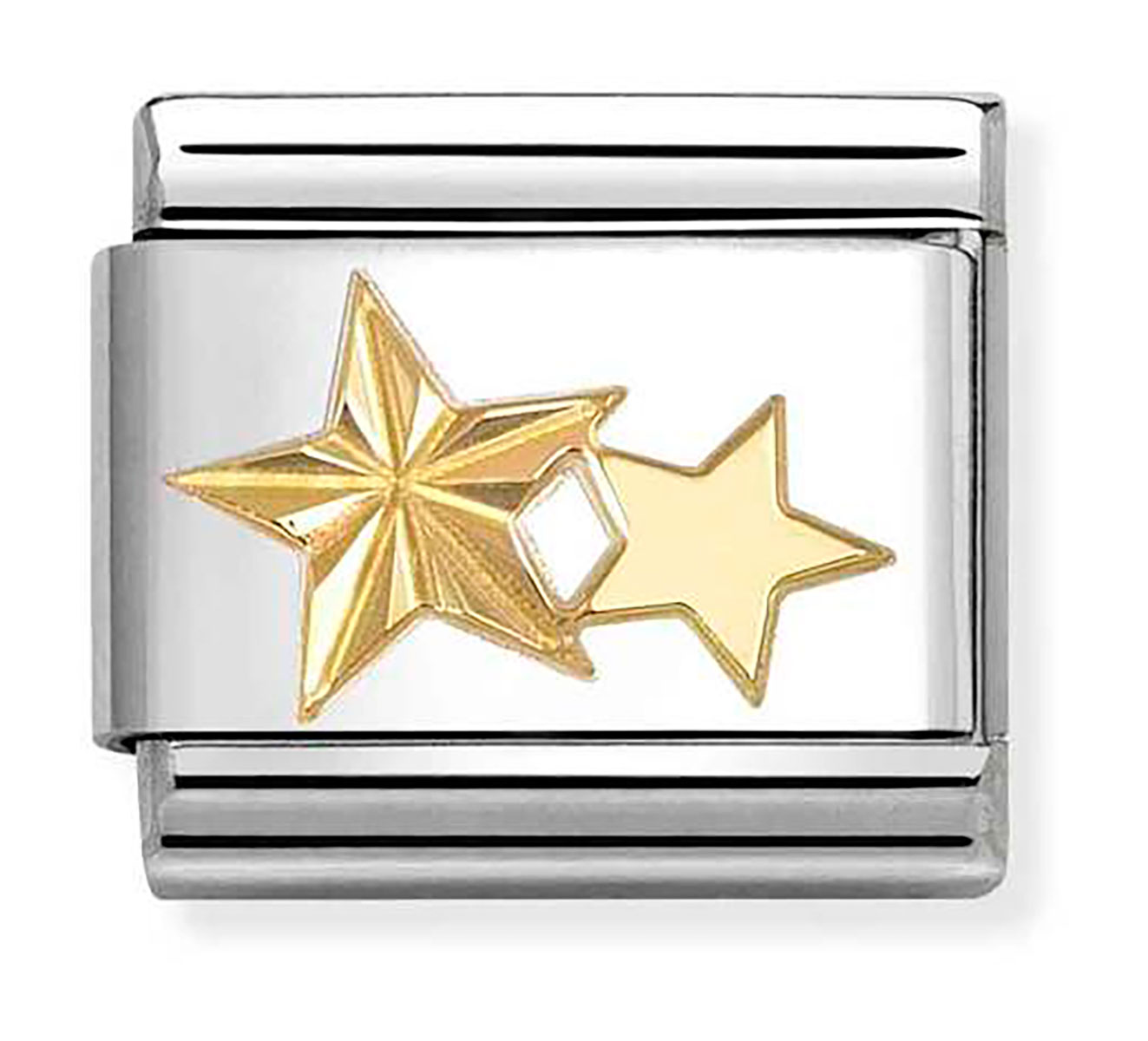 Nomination Composable Classic Symbols Tähti 030149/65 -korun pinta on koristeltu 18-karaatin kullalla ja sen runko on ruostumatonta terästä. Palassa on kuvattuna kaksi kullattua ja erikokoista tähteä. Koko: 0,7 x 1 cm. Italialaisilla Nomination-paloilla on kahden vuoden takuu, ja ne toimitetaan valmistajan alkuperäisessä pakkauksessa.