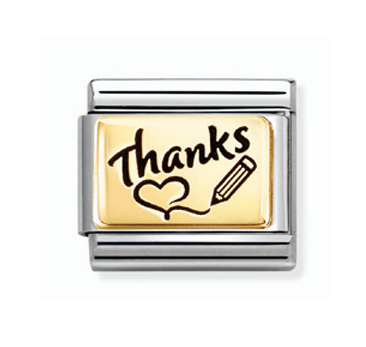 Ilmaise kiitollisuutesi kauniilla tavalla tällä Nomination Composable Classic Thanks -palalla. Tämä laadukas ruostumattomasta teräksestä valmistettu linkki on koristeltu aidolla 18 karaatin kultalaatalla, johon on kaiverrettu herkkä "Thanks"-teksti, sydän ja kynäsymboli.