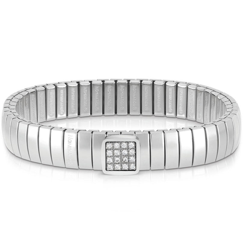 Nomination Dama rannekoru 043606/001. Rannekorusta on yksi koko, joka venyy tarvittavaan mittaan. Korussa kivinä synteettisiä Zirconiaioita. Toimitetaan valmistajan alkuperäisessä lahjarasiassa postikuluitta!