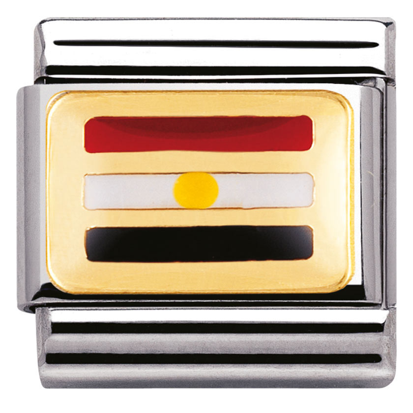 Nomination Egyptin lippu 030237-17. Lippupalat ovat esimerkiksi hauskoja muistoja maista, joissa olet vieraillut tai maista joita rakastat. Nomination palat ovat valmistettu laadukkaasta ruostumattomasta teräksestä ja 18k kullasta. Palojen värikäät kohdat ovat emalia. Nomination paloille myönnetään kahden vuoden takuu ja ne toimitetaan valmistajan alkuperäisessä pakkauksessa.
