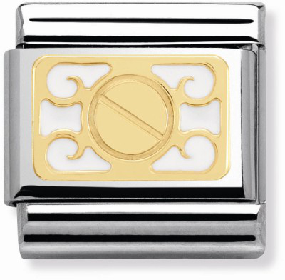 Nomination 030280-12, Elegance. Pala kuuluu tyylikkääseen Nomination Elegance sarjaan. Nomination palat ovat valmistettu laadukkaasta ruostumattomasta teräksestä ja 18k kullasta. Palojen värikäät kohdat ovat valkoista emalia. Nomination paloille myönnetään kahden vuoden takuu ja ne toimitetaan postikuluitta!