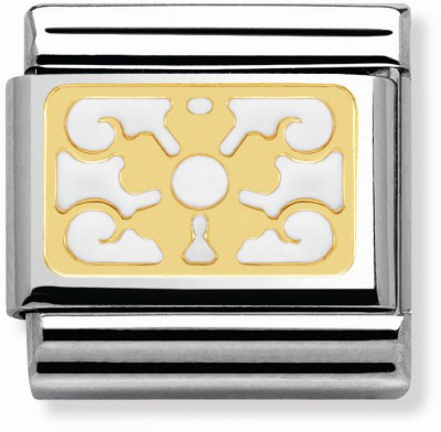 Nomination 030280-13, Elegance. Pala kuuluu tyylikkääseen Nomination Elegance sarjaan. Nomination palat ovat valmistettu laadukkaasta ruostumattomasta teräksestä ja 18k kullasta. Palojen värikäät kohdat ovat valkoista emalia. Nomination paloille myönnetään kahden vuoden takuu ja ne toimitetaan postikuluitta!