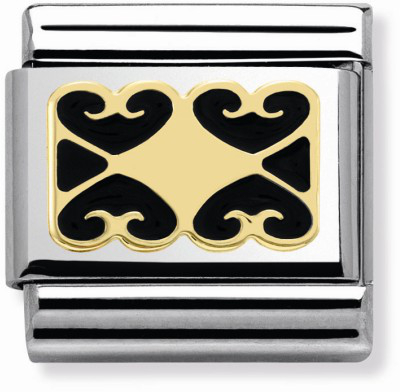 Nomination 030280-25, Elegance. Pala kuuluu tyylikkääseen Nomination Elegance sarjaan. Nomination palat ovat valmistettu laadukkaasta ruostumattomasta teräksestä ja 18k kullasta. Palojen värikäät kohdat ovat mustaa emalia. Nomination paloille myönnetään kahden vuoden takuu ja ne toimitetaan postikuluitta!