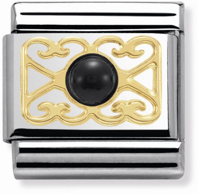 Nomination 030513-04, Elegance. Pala kuuluu tyylikkääseen Nomination Elegance sarjaan ja palaan on istutettu musta agaatti korukivi. Nomination palat ovat valmistettu laadukkaasta ruostumattomasta teräksestä ja 18k kullasta. Nomination paloille myönnetään kahden vuoden takuu ja ne toimitetaan postikuluitta!