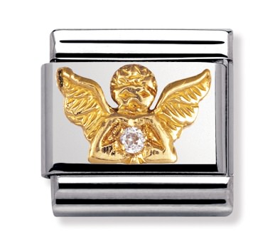 Nomination enkeli 030307-23. Nomination kivelliset palat ovat valmistettu laadukkaasta ruostumattomasta teräksestä ja 18k kullasta. Lisäksi niihin on istutettu synteettisiä Zirconia korukiviä. Nomination paloille myönnetään 2 vuoden takuu, ja ne toimitetaan valmistajan omassa rasiassa.