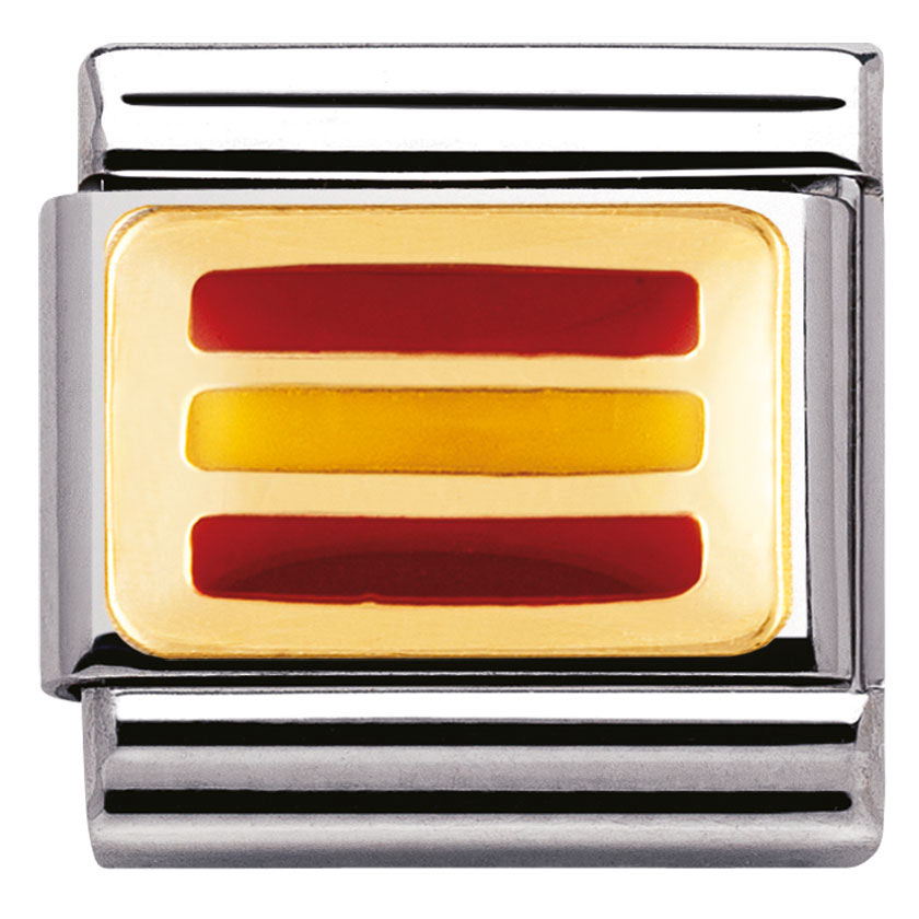 Nomination Espanjan lippu 030234-18. Lippupalat ovat esimerkiksi hauskoja muistoja maista, joissa olet vieraillut tai maista joita rakastat. Nomination palat ovat valmistettu laadukkaasta ruostumattomasta teräksestä ja 18k kullasta. Palojen värikäät kohdat ovat emalia. Nomination paloille myönnetään kahden vuoden takuu ja ne toimitetaan valmistajan alkuperäisessä pakkauksessa.